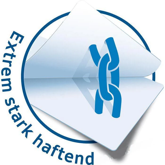 sonstiges: extra stark klebend (auch auf feuchten, warmen, rauen oder staubigen Oberflächen), selbstklebend, schnittgestanzt, ohne Rand, aus chlorfrei gebleichtem Papier